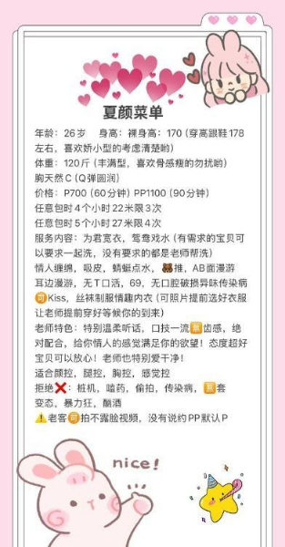 服务和菜单一致,本人和照片差距不大,身材很哇塞,水多很骚气,叫床声音很好听,易高潮,推荐。 ...